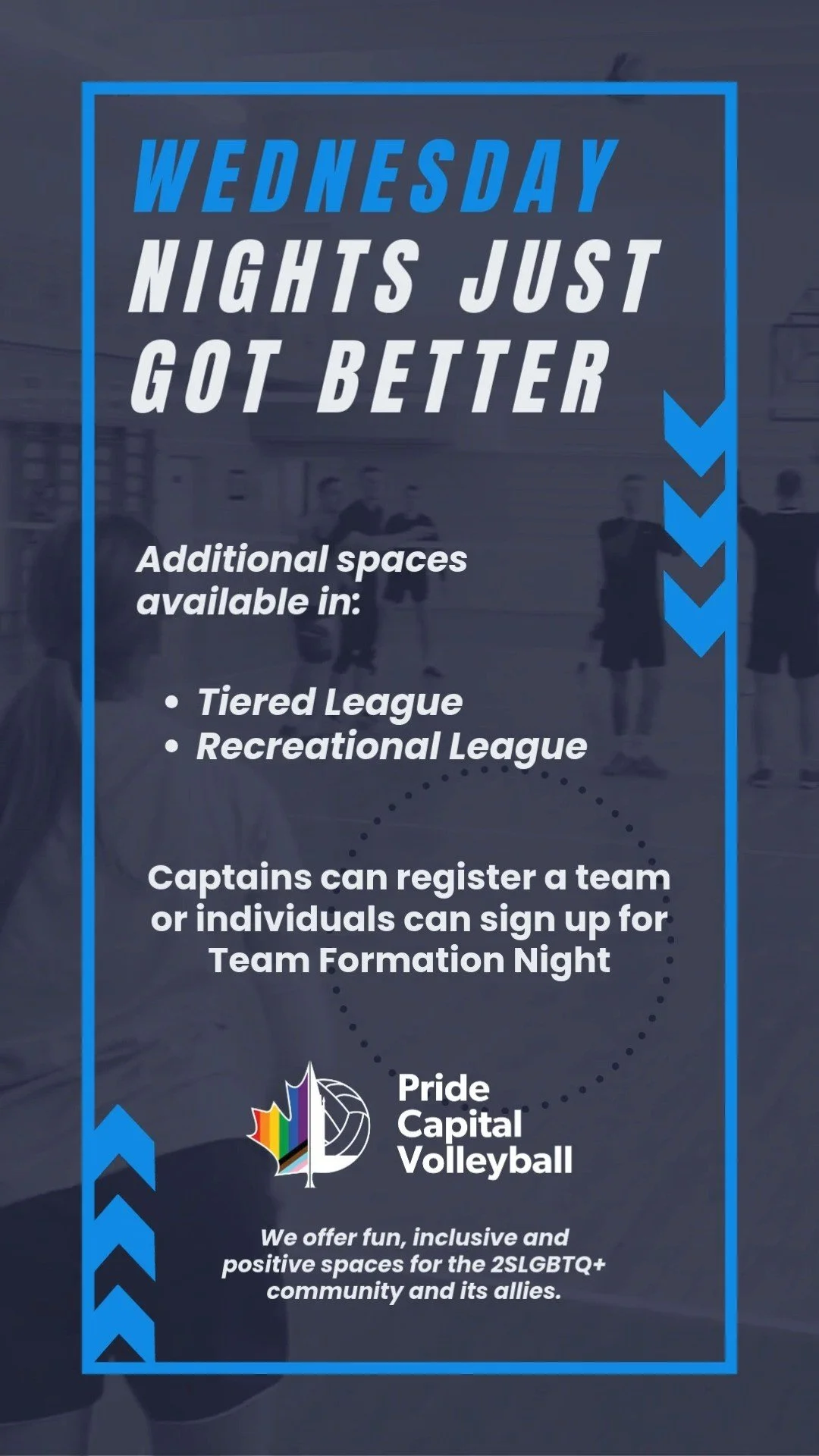 Pride Capital Volleyball (PCV) is a non-profit volleyball organization that promotes volleyball and the well-being of the 2SLGBTQ+ community of the National Capital Region by offering fun, inclusive, and positive spaces for 2SLGBTQ+ people and allies of all skill levels.